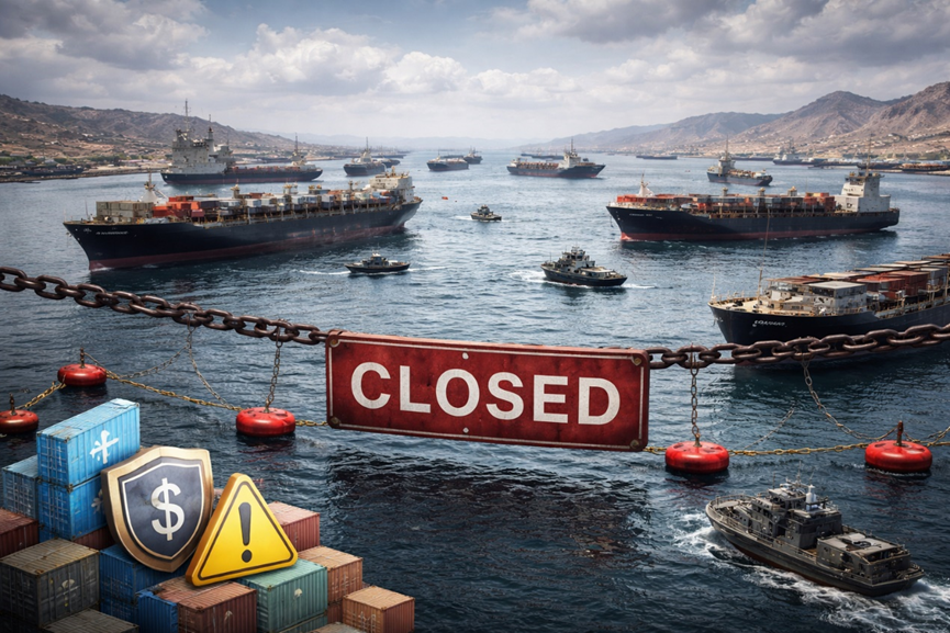 (圖說)美伊衝突升溫下,荷莫茲海峽航運幾近停擺,油輪與貨櫃船滯留海上,「關閉」警示象徵全球能源動脈受阻;戰爭風險升高不僅推升保險成本,也對國際供應鏈與金融市場形成全面壓力。隨著美伊衝突急遽升溫,全球最重要的能源咽喉——荷莫茲海峽——在極短時間內從繁忙的黃金水道轉變為全球航運與保險市場的高危警戒區。隨著通過海峽的船舶流量大幅萎縮,全球能源供應鏈正經歷一場前所未有的「多險種、多主體」實戰壓力測試。